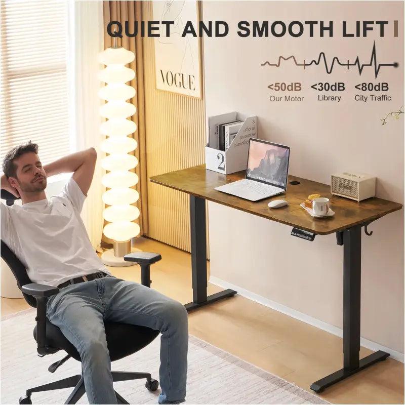Het BukkitBow zit-sta bureau is ontworpen met stabiliteit, duurzaamheid en stijl in gedachten. Het beschikt over een ruim tafelblad van 120 x 60 cm of 140 x 60 cm met afgeronde hoeken en kabeldoorvoer, evenals twee haken voor het ophangen van hoofdtelefoons of tassen. Het bureau is gemaakt van een versterkt metalen frame in T-vorm en E1-kwaliteit spaanplaat, waardoor het extreem robuust is en tot 80 kg kan dragen. Met een geluidsniveau van minder dan 50 dB werkt dit bureau stil en onopvallend, waardoor u zich volledig kunt concentreren op uw taken. Het wordt geleverd met een eenvoudig te monteren montagekit en gedetailleerde instructies, waardoor u snel en gemakkelijk aan de slag kunt.