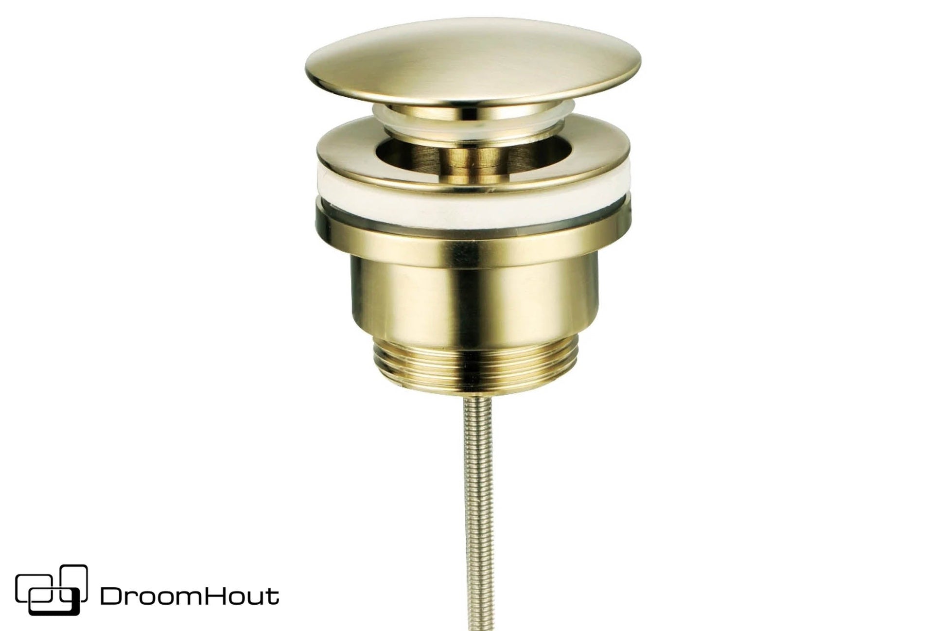 Deze geborsteld goud clickwaste is een onmisbaar detail in jouw badkamer of toiletruimte. Perfect te combineren met een geborsteld goude kraan, zodat je een prachtig geheel creëert. Bestel vandaag nog bij DroomHout en geniet van stijlvol gebruiksgemak!