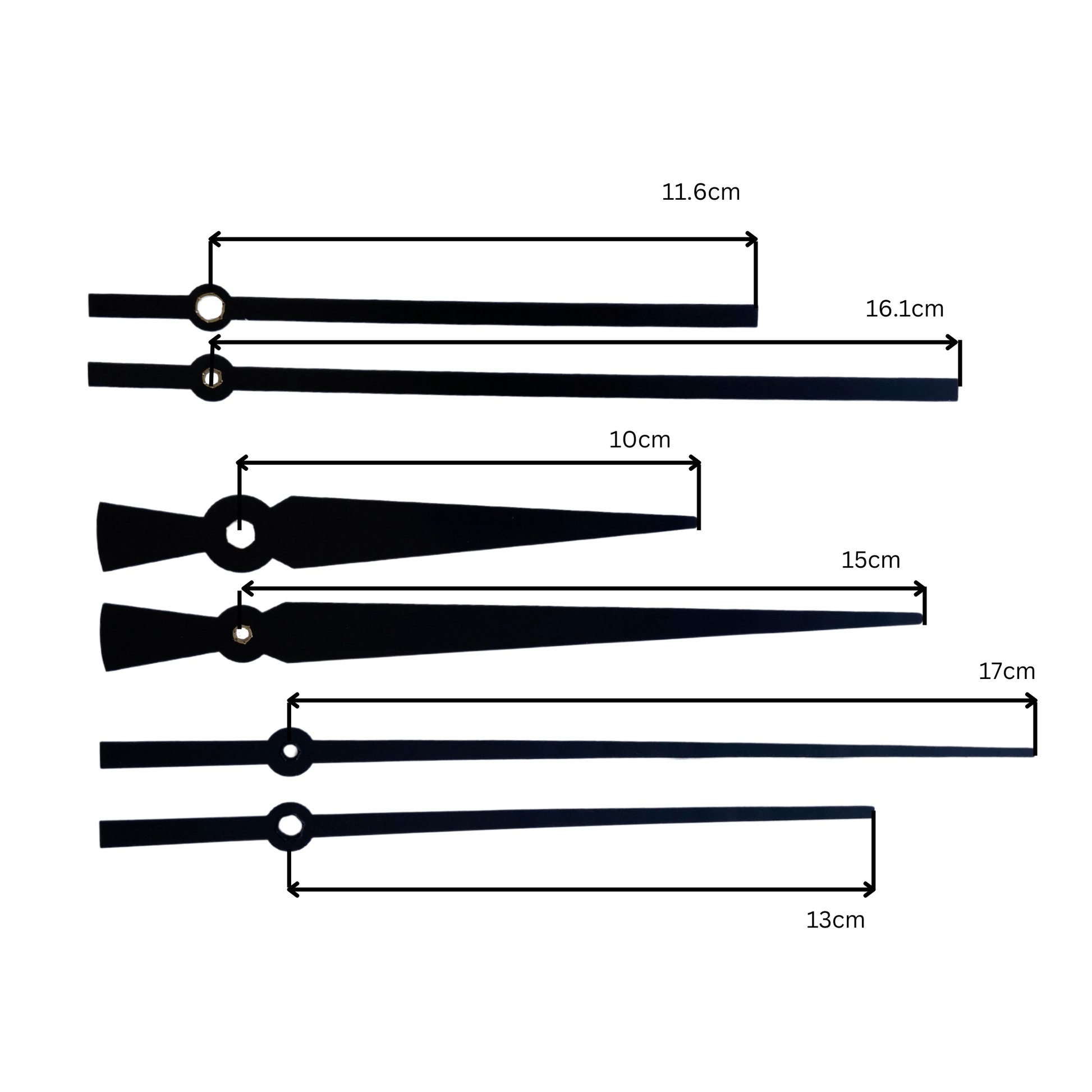 The hands you need to have a beautiful clock on the wall. A clock hand is an arm that connects to the shaft on a clock movement that overlays over a clock dial face and points to the numerals or symbols on the clock face or watch that displays the time. Most clocks have a short hour hand a long minute hand and a long second hand to display the time. This set contains of 3 large sets of hands for a clock that must be bigger then Ø35cm diameter.