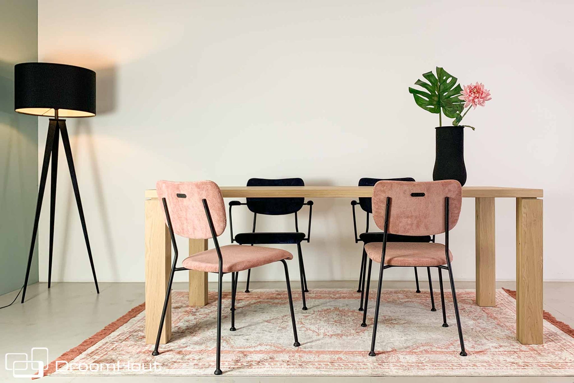 Over het ontwerp kunnen we kort zijn. Dat is gewoon apestrak. Kijk naar de prachtige strakke lijnen van blad en poten. Kenmerkend aan deze houten eettafel is dat de poten helemaal op de hoeken staan. Dat maakt dat je onder je tafel maximale vrijheid hebt voor je benen. En dus geen tafelpoten meer tegenkomt. Ook handig als je je stoelen maximaal wilt kunnen aanschuiven. Dat kan bij eettafel DREAUM Nuova. De poten hebben nog een schitterend design detail. Bij de aanhechting van de poten aan het blad zie je een slanke ruimte van circa een centimeter. Daardoor lijkt het alsof het blad zweeft boven de poten. Maar niets is natuurlijk minder waar want het eindresultaat is een houten eettafel die staat als een huis.Houten eettafel op maat