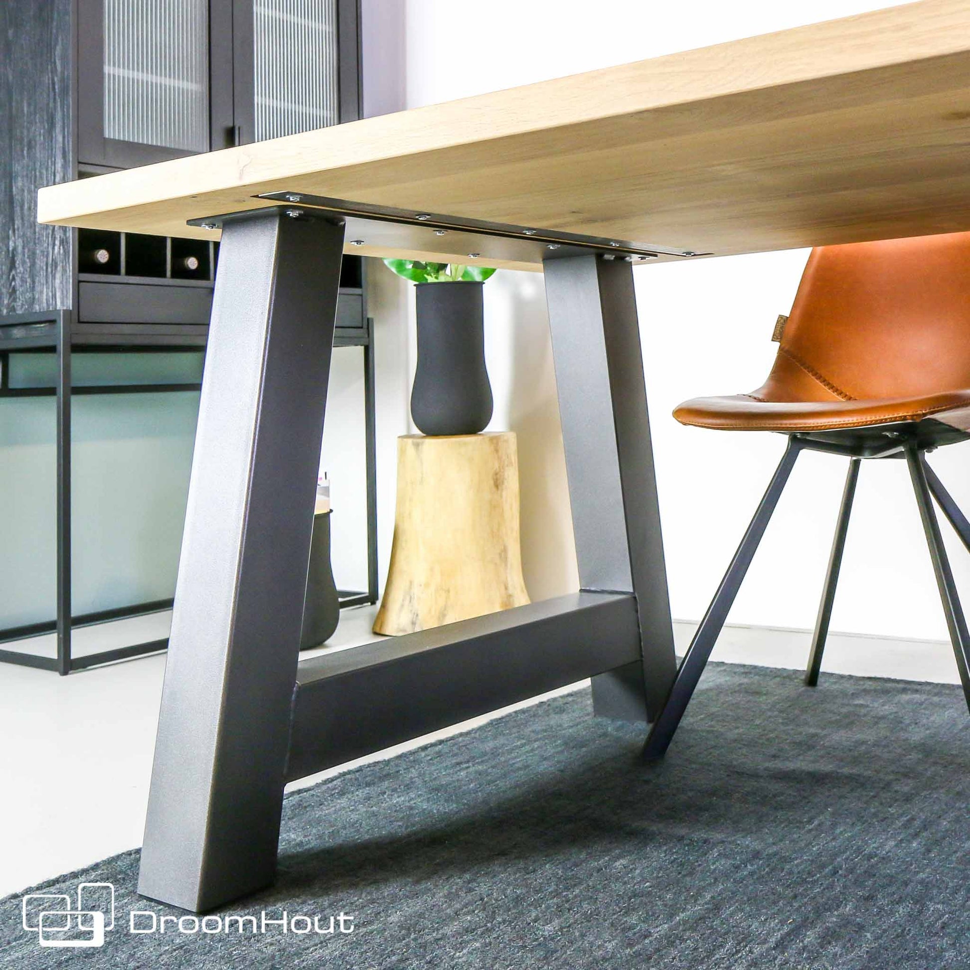 De tafel Robusto is voorzien van een H-poot. Deze is gemaakt van blank staal, waardoor het een industriële look geeft aan de tafel. De H-poten zijn iets naar binnen geplaatst, zodat je ook op de kop van de tafel lekker zit. De Robusto heeft een hele goede afwerking, waardoor je heerlijk kunt leven aan de tafel. Er zit een 2 componenten lak op het tafelblad, dit houdt in dat het optimaal beschermd is. Hou je van de natuurlijke uitstraling van eiken, dan kies je voor een blank eiken blad. Wil je warmer eiken, dan behandelen wij het blad voor met een naturel olie. Houd je van een frisse look, dan is de wit eiken variant wat voor jou.