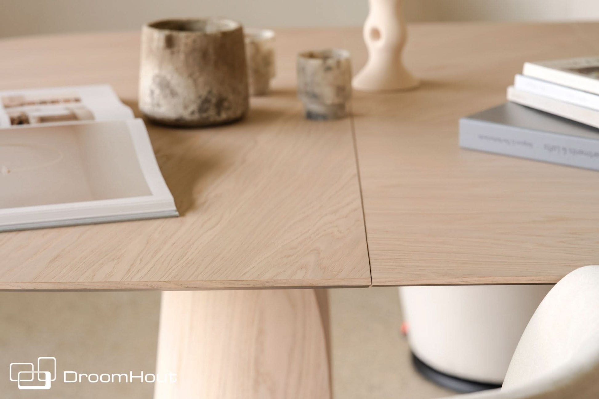 Ruimte besparen en genoeg plek willen hebben aan de eettafel? Ga voor de uitschuifbare variant van de Blossom! De minimalistische stijl en unieke gespleten ronde poot van de Blossom eettafel geven een onmiskenbare Scandinavische sfeer met een knipoog naar de jaren 70. De toplaag van de tafel is gemaakt van fineer en past als een puzzel in elkaar. De ovale vorm van de tafel, gecombineerd met het mozaïek patroon, zorgt voor een opvallende toevoeging aan elke ruimte. Als je op zoek bent naar een slank, organisch en minimalistisch design voor je interieur, dan is de Blossom tafel de perfecte keuze. Toch op zoek naar een andere vorm, neem een kijkje in onze collectie houten eettafels.