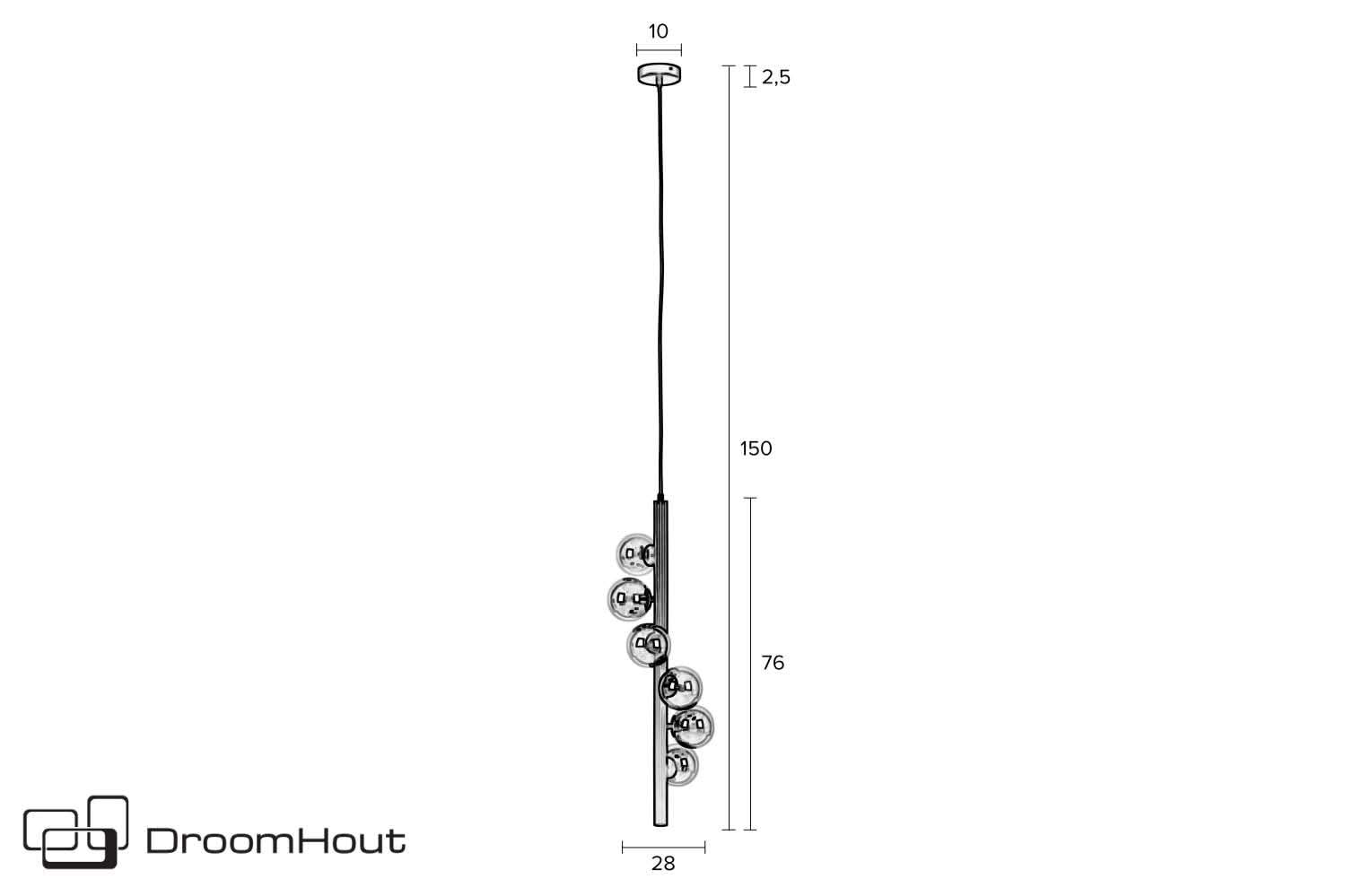 Het frame van hanglamp Monica is recht en strak zwart gelakt. Aan dit frame zijn maar liefst 6 glazen bollen bevestigd. Je hebt de keuze uit smoke glas of opaal glazen bollen. Het geheel hangt aan een 150 cm lange zwarte katoenen kabel. Deze kabel is natuurlijk in te korten. De totale afmeting is ø 28 x 150 cm.