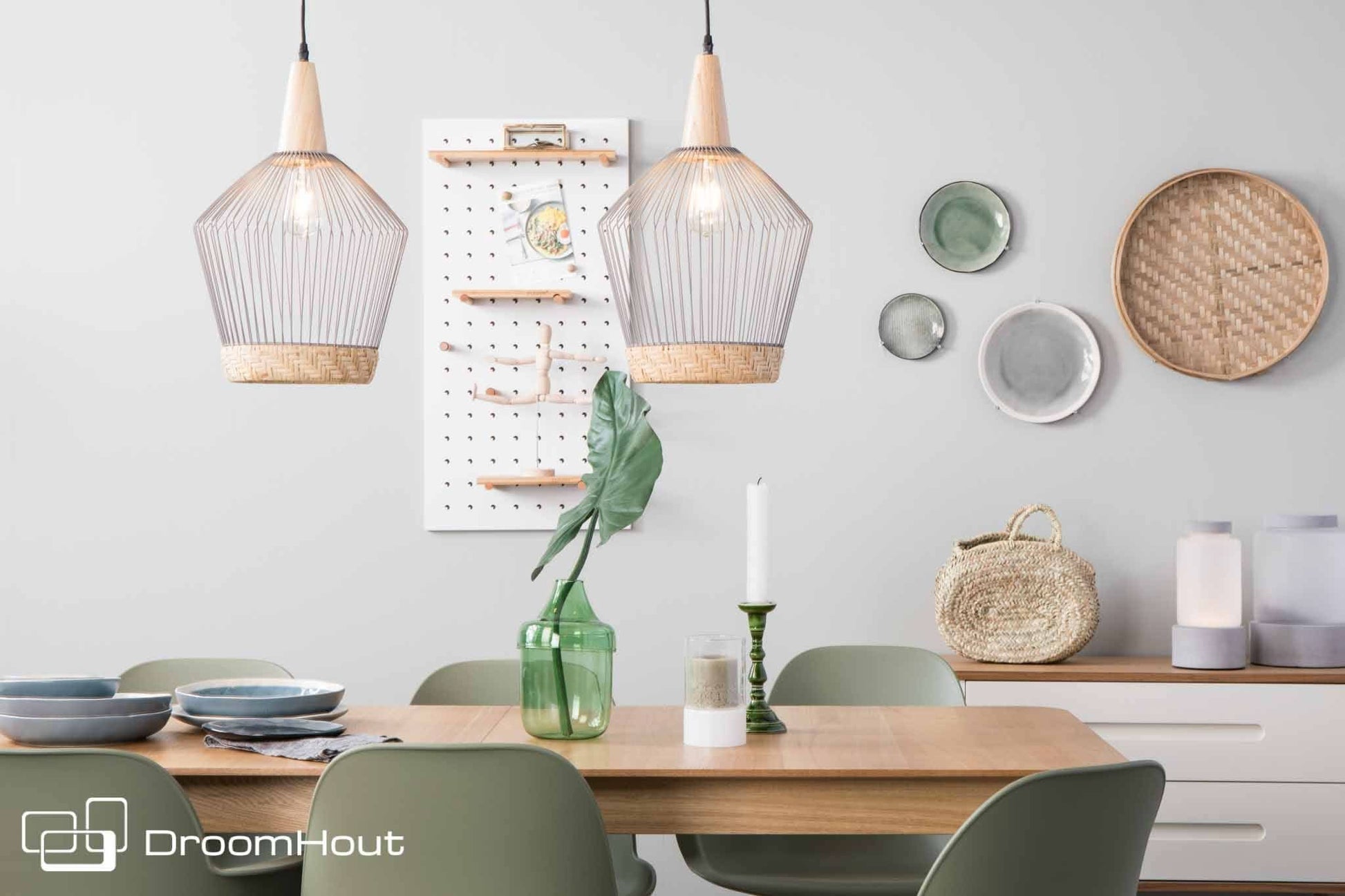 Het combineren combineren van de lampen vinden wij heel stijlvol. Hang de lampen naast elkaar boven de tafel of in de hal. Het mooie matte grijs in combinatie met de rieten rand, geven de lamp een elegante look. Daarnaast schijnt het licht speels door het ijzerdraad.