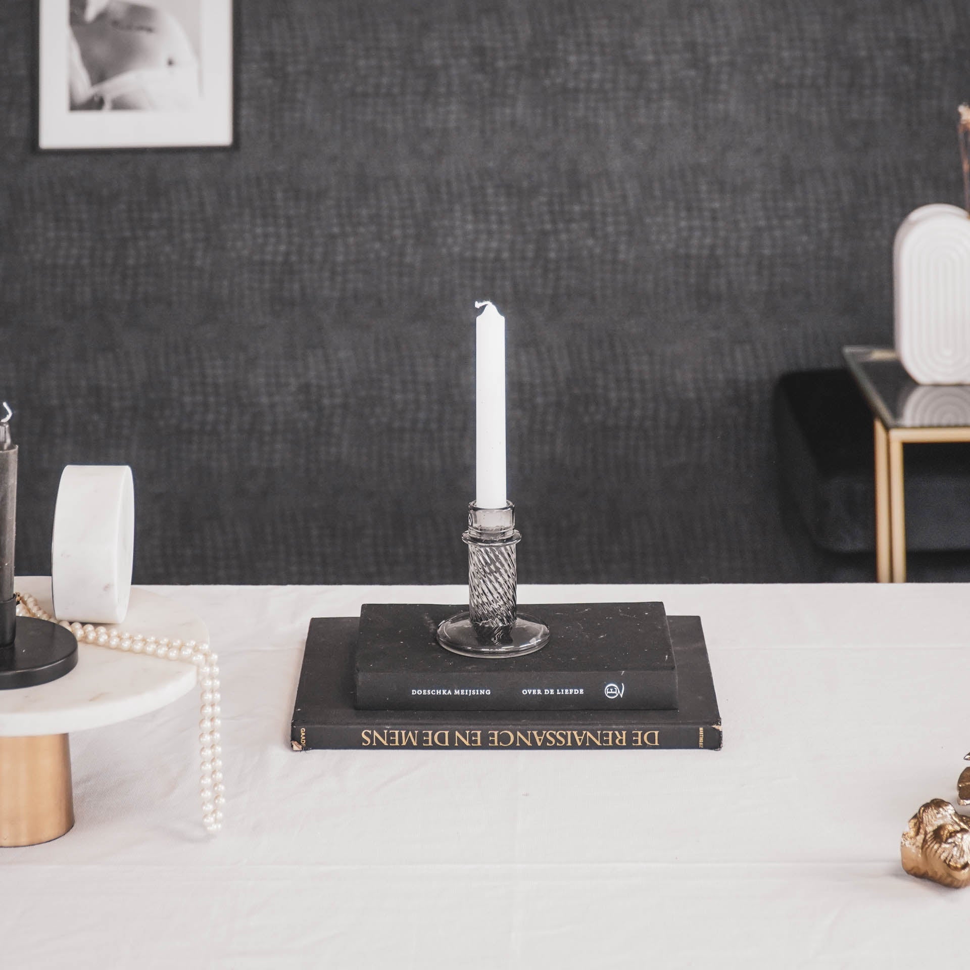 LIGHT IT UP- Ben je op zoek naar een stijlvolle toevoeging aan je interieur? Deze prachtige kaarshouder-kandelaar van Housevitamin is precies wat je nodig hebt! Gemaakt van glas met een mooi reliëf, deze grijze kaarshouder is de perfecte combinatie van elegantie en modern design. Voeg wat sfeer toe aan je woning met deze mooie kaarshouder!