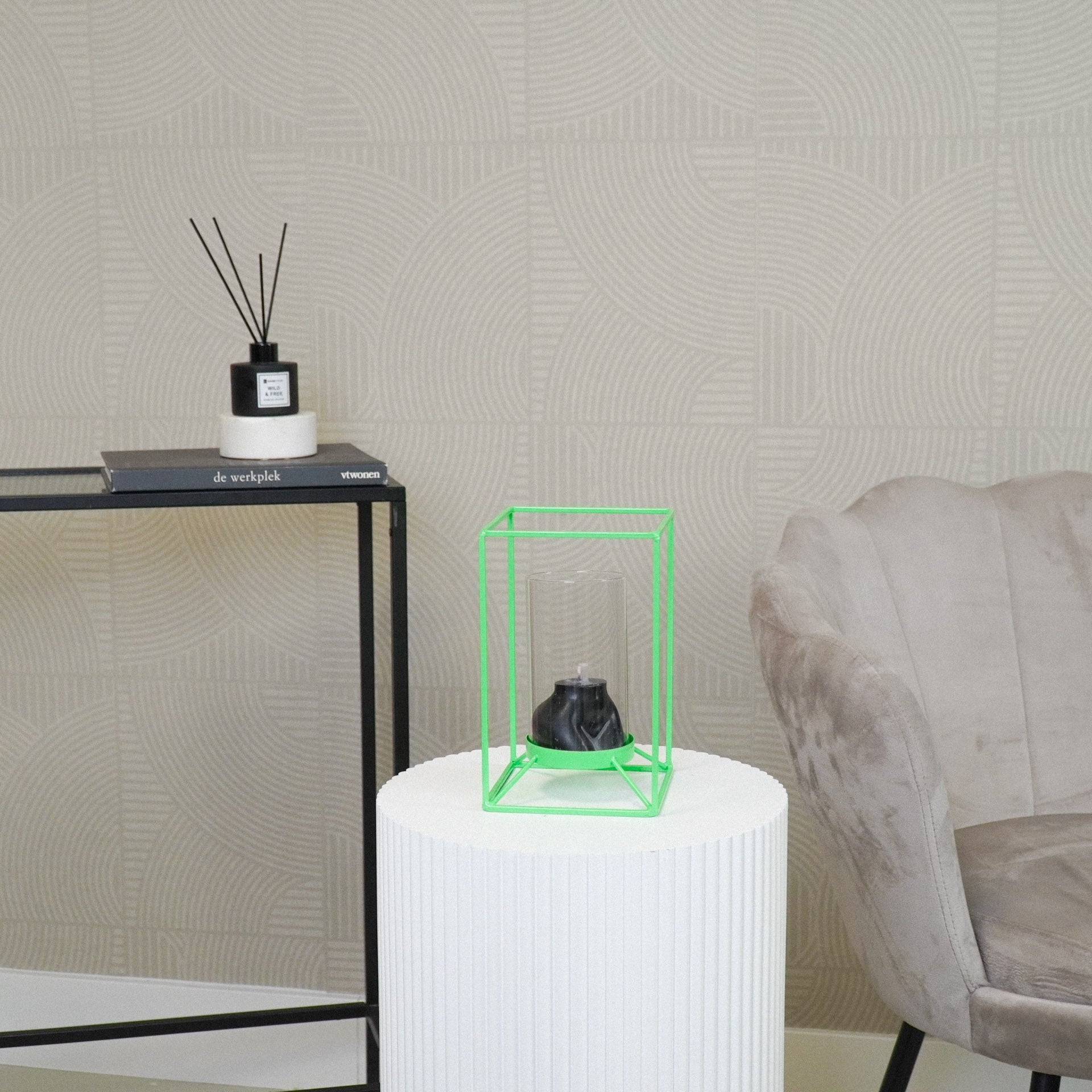 Kaarshouder- Windlicht - Metaal/Glas - Fluor Groen - 12,5x12,5x20cm