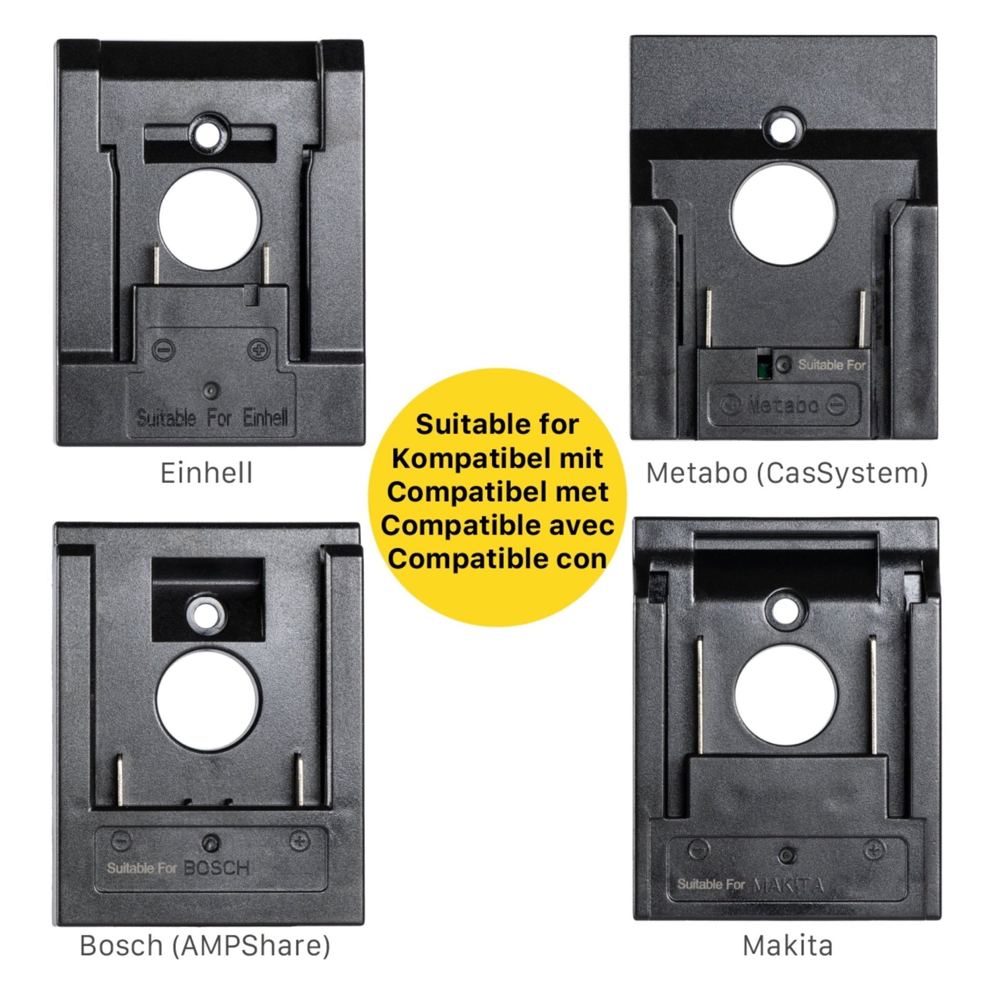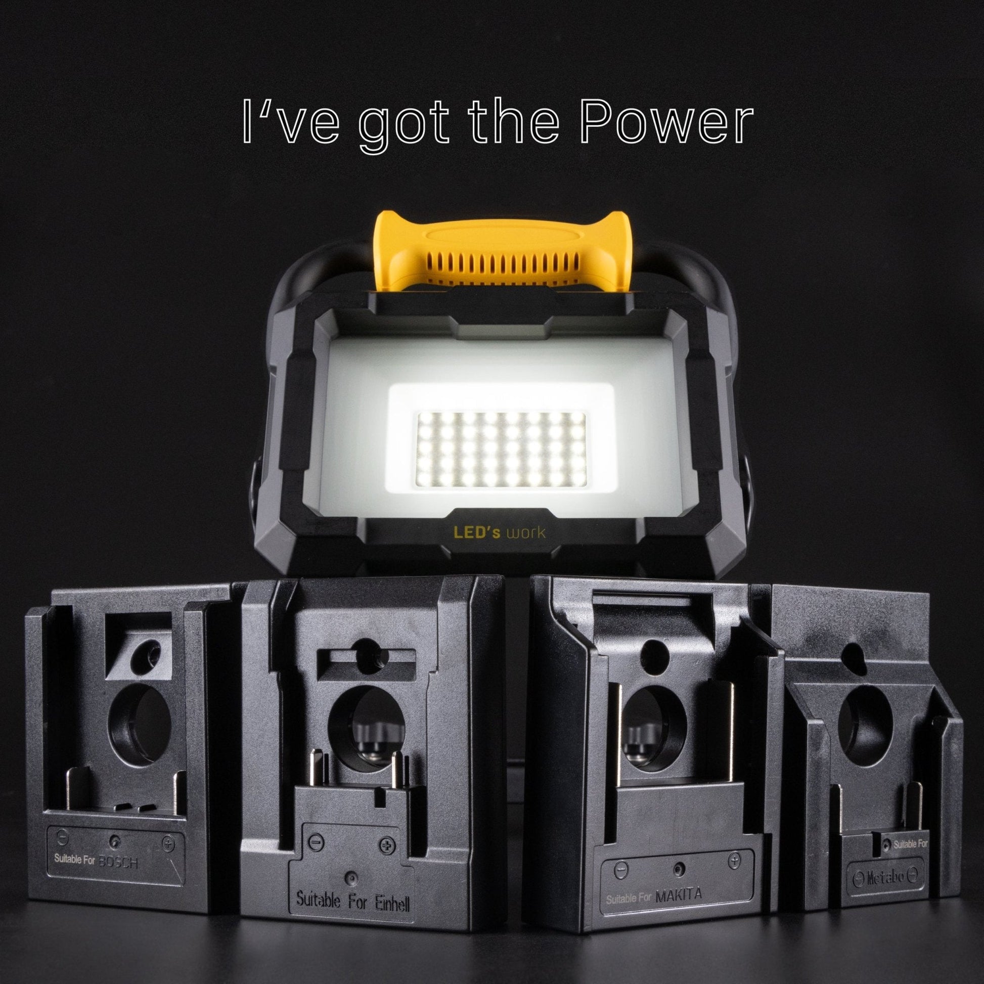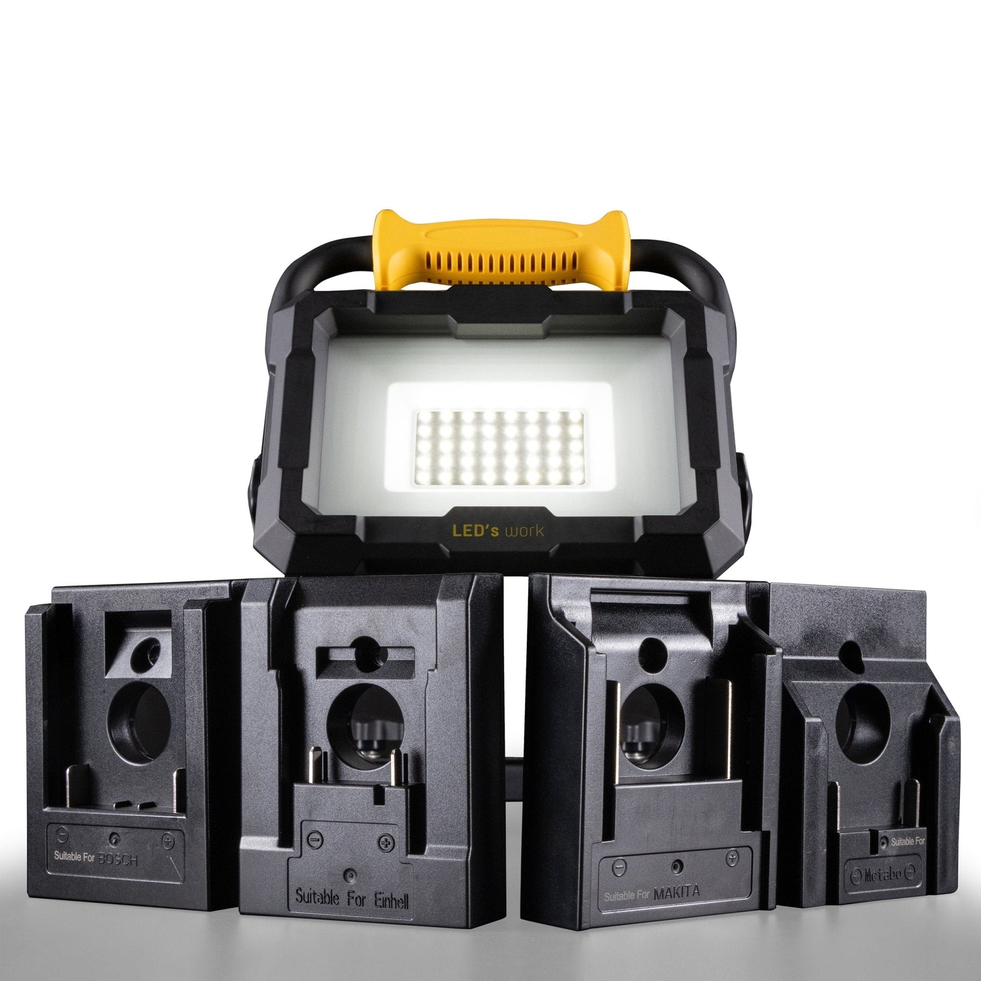 Wat deze bouwlamp uniek maakt? Laten we beginnen met het feit dat hij werkt op 18V batterijen van de merken Makita, Bosch, Metabo (CAS) en Einhell. Een extern batterijsysteem hoef je dus niet meer aan te schaffen. We leveren 4 verschillende adapters mee waar je je bestaande accu in plaatst. Een kind kan de was doen!