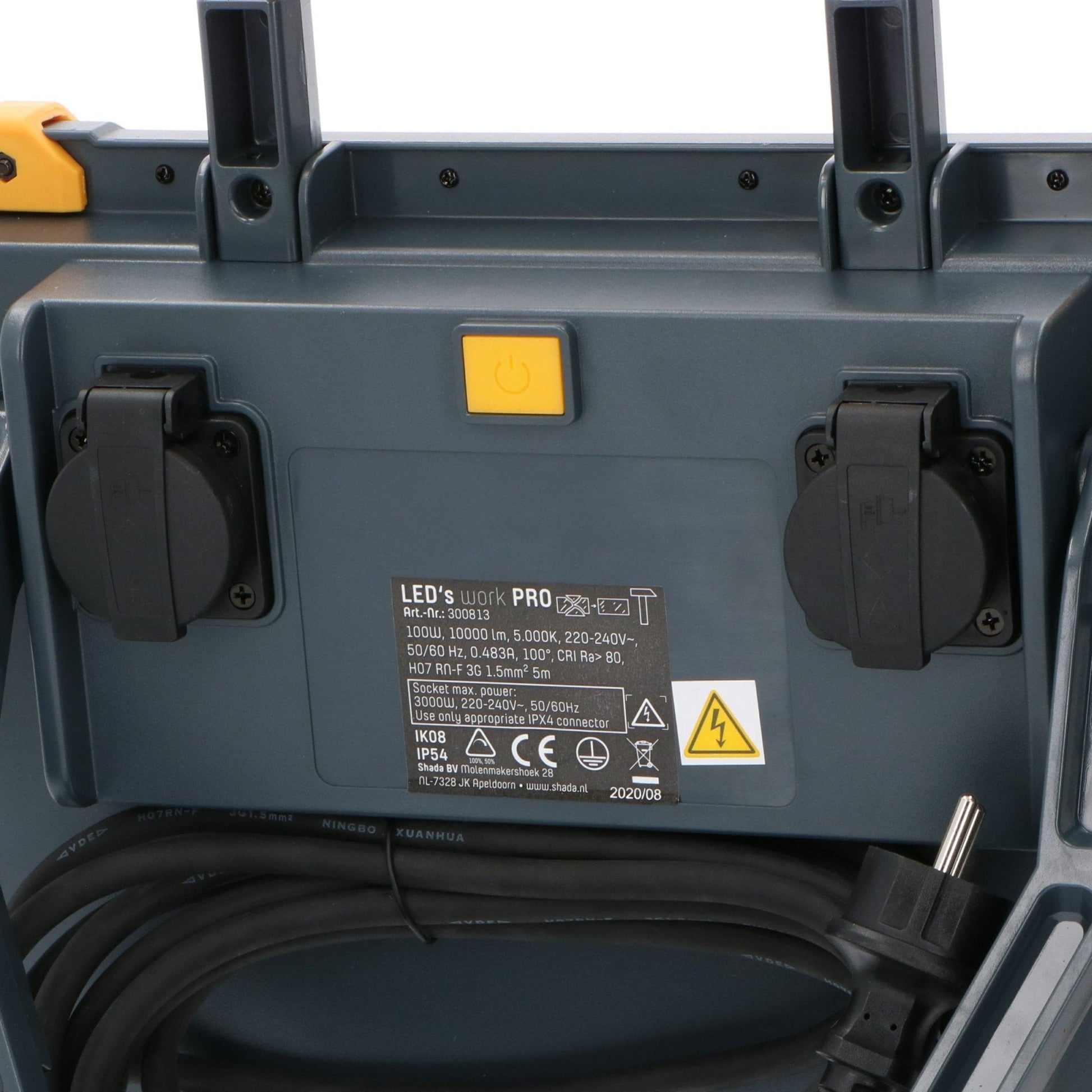 Naast de uitstekende verlichtingsprestaties is onze 100W Pro LED bouwlamp ook nog eens uitgerust met handige extra’s. Zo is er op de achterkant een stopcontact aanwezig, zodat je eenvoudig elektrische apparatuur kunt aansluiten of je smartphone op kunt laden. Het compacte formaat maakt hem makkelijk mee te nemen naar iedere locatie en het opvouwbare ontwerp zorgt ervoor dat hij gemakkelijk in een volle werkbus past. Dankzij de 5 meter lange stroomkabel heb je bovendien veel bewegingsvrijheid.