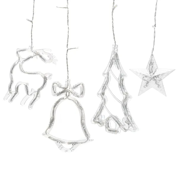 Wat deze ijspegel lichtstring echt bijzonder maakt zijn de prachtige decoratieve vormen die tussen de hangende slingers zijn verwerkt. Van feestelijke bellen en glinsterende sterren tot een sierlijk hert en een klassieke kerstboom - elk element voegt extra charme en karakter toe aan je kerstdecoratie. De meerkleurige LED's zorgen voor een vrolijke, feestelijke uitstraling die perfect past bij de gezellige kerstsfeer.