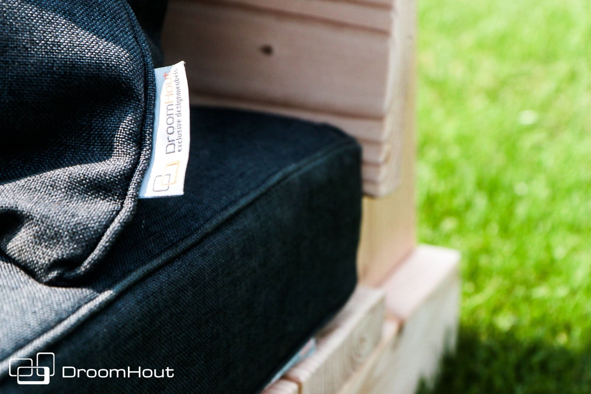 De bijgeleverde loungekussens uit de DroomHout huiscollectie zijn helemaal zelf te personaliseren. Kies jouw droomstof uit en laat het ons weten welke het is geworden. Het voordeel van deze stoffen is doordat er polyester in verwerkt is de loungekussens minder snel verkleuren dan katoenen hoezen. De royale loungekussens hebben maar liefst een zittingmaat van 70 x 70 cm bij een dikte van 12 cm, dat is groter en dikker dan bijna alle andere loungekussens die op de markt verkrijgbaar zijn.