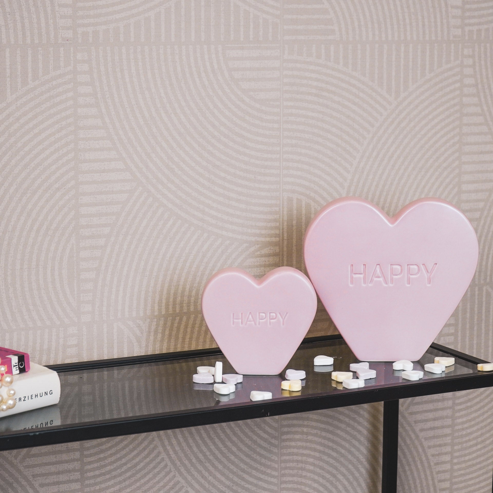 Ornament- Snoephart Beeldje 'HAPPY'- Keramiek- Licht Roze- 13x4x11,5cm