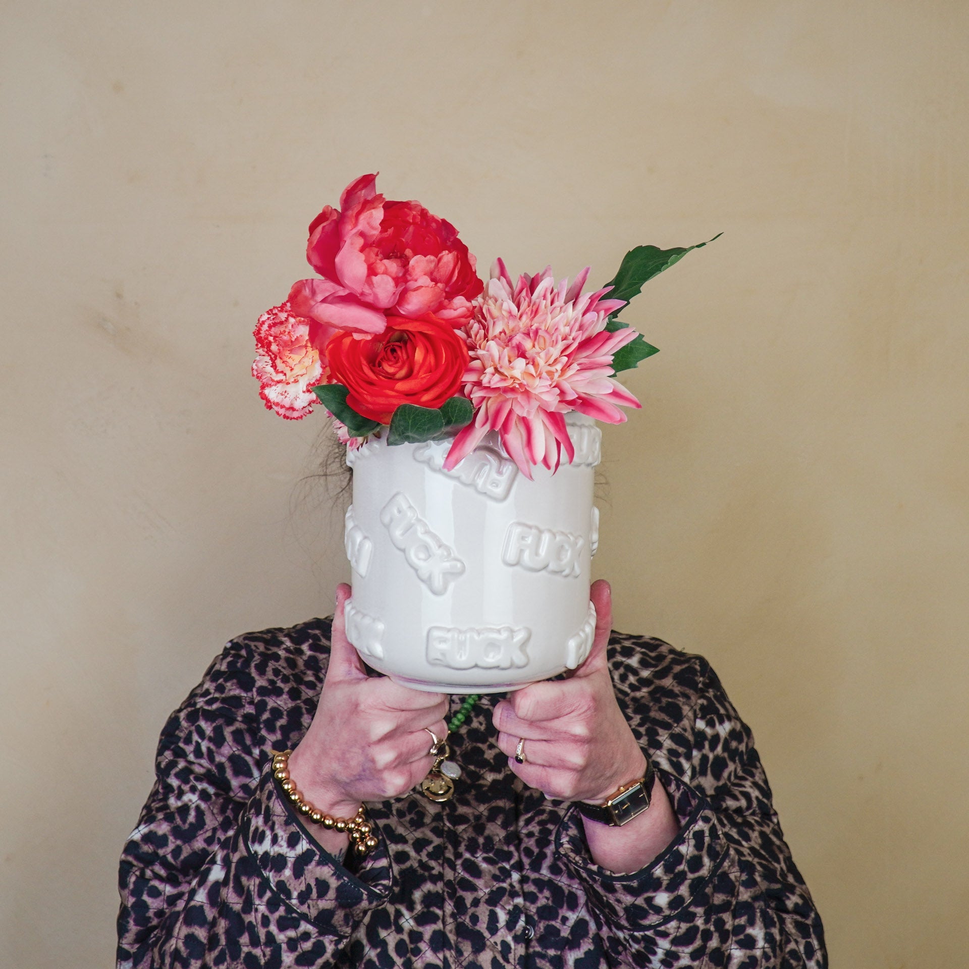 Styling tip: Geef hem een mooie plek ergens in huis, dat verdient deze mooie bloemen vaas en planten pot met 'Fuck' woorden.
