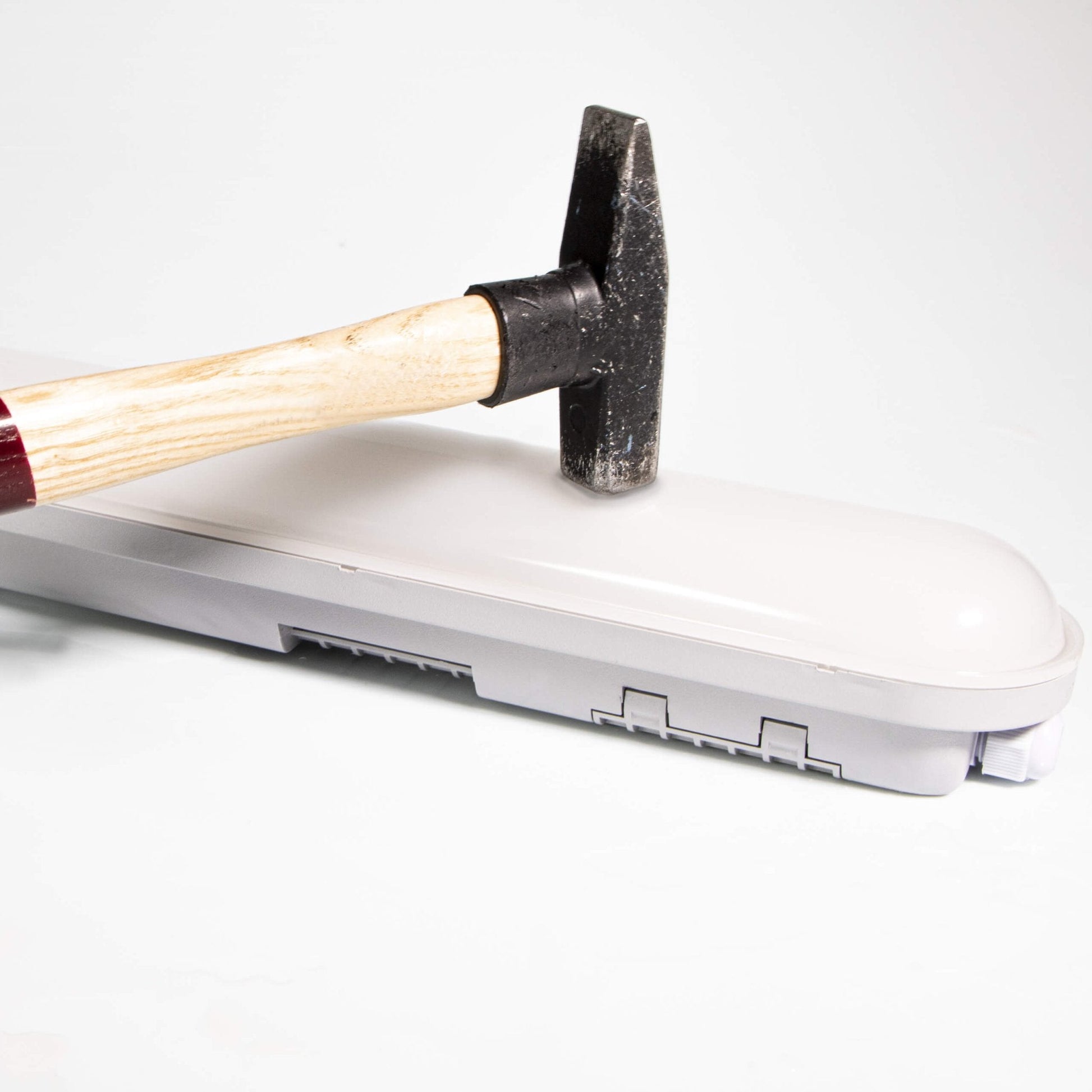 De behuizing van dit Premium LED TL armatuur is vervaardigd van slagvast polycarbonaat. Zijn superieure bescherming tegen vallen en stoten heeft hem de IK08-classificatie opgeleverd. Tevens beschikt het armatuur over de IP65-normering, want ook stof, vocht en zelfs waterstralen dringen niet door in de behuizing. Deze LED TL balken kun je dus ook buiten gebruiken.