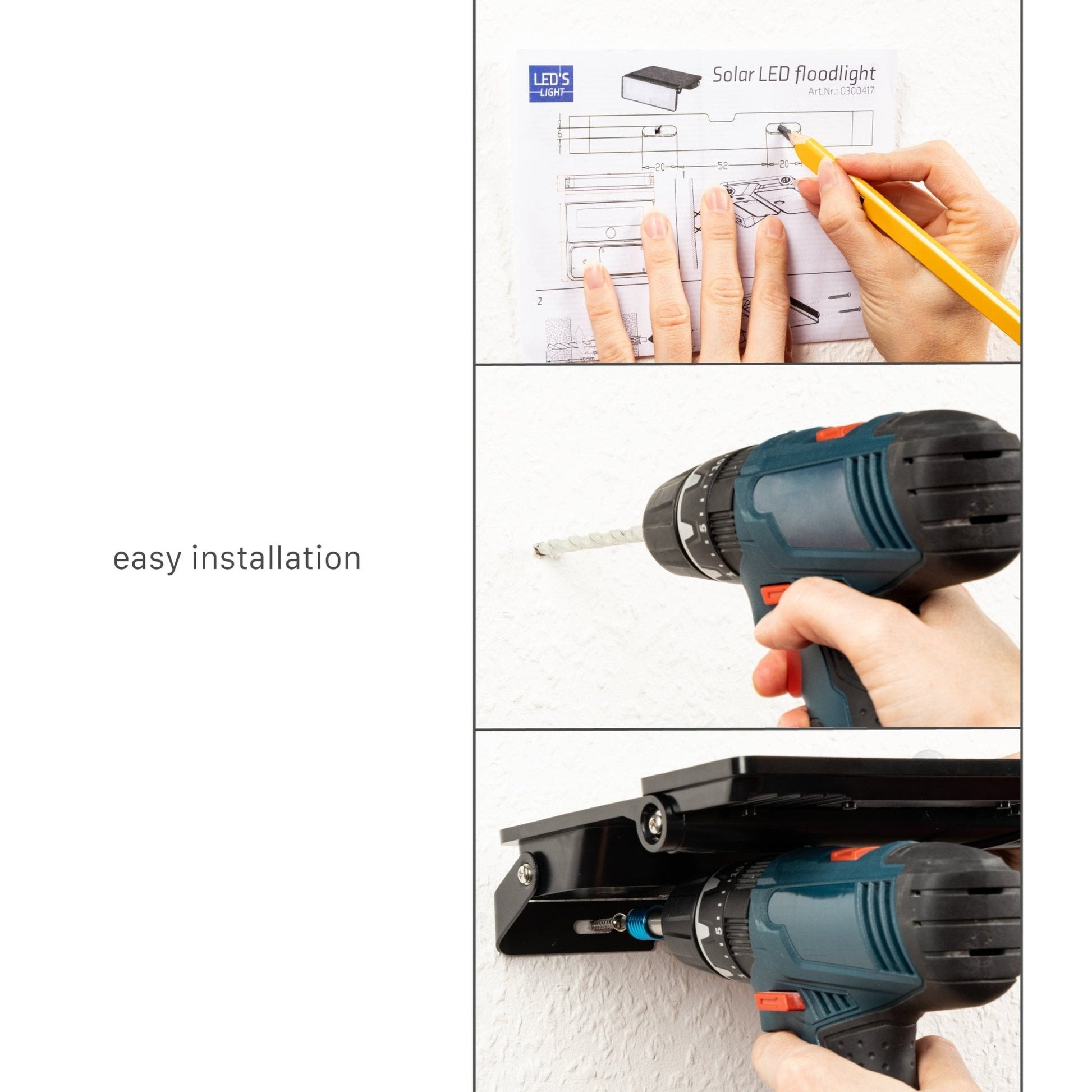 Ook op het gebied van installeren is het natuurlijk voordelig dat de lamp op zonne-energie werkt. Zodoende komt er totaal geen bedrading aan te pas. Je monteert de ultraslanke buitenlamp met behulp van de gebruiksvriendelijke beugel zo aan de muur, schutting, etc. De lamp is IP54 waterdicht, dus je bent ervan verzekerd dat hij elke regenbui met gemak trotseert.