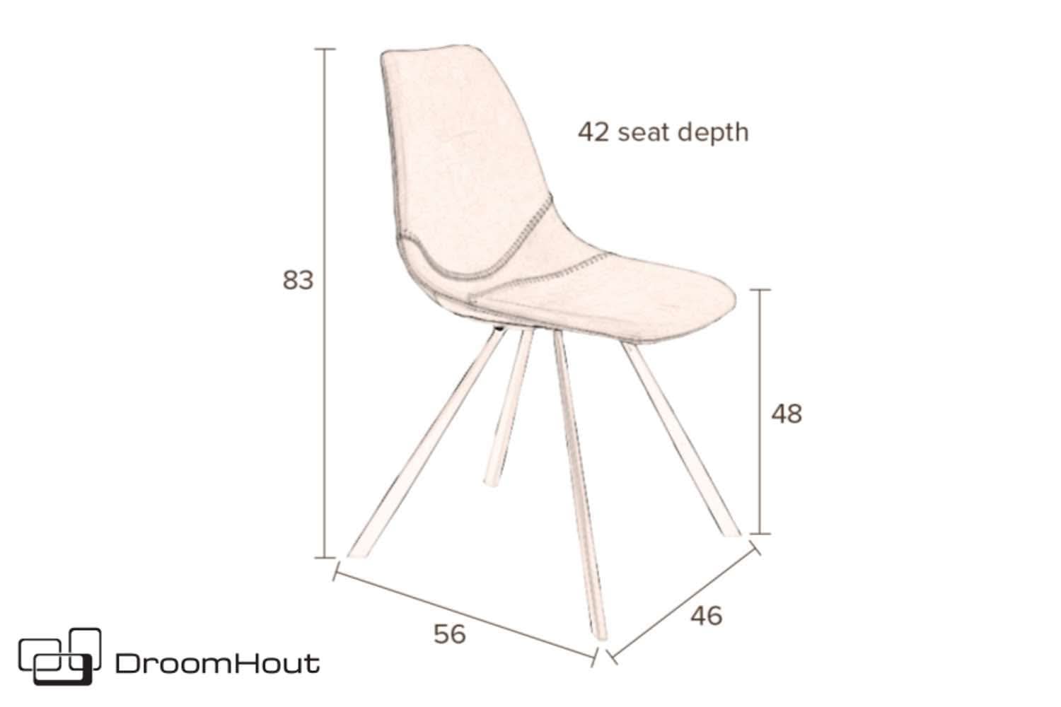 De Franky Chair velvet heeft een fluwelen zitting (polyester) en het onderstel is van zwart gepoedercoat staal met beschermdoppen. Kies uit de kleuren grijs, oranje en petrol. Durf zeker te combineren! De afmetingen van de stoel zijn 83 x 46 x 56 cm (h x b x d). De zithoogte is 48 cm en de zitdiepte is 42 cm. De perfecte afmetingen voor aan vrijwel elke tafel en bureau. De stoelen kun je bestellen per set van 2 stuks. Ook leuk om te matchen met de cognac kleurige en zwarte leather look Franky chairs.