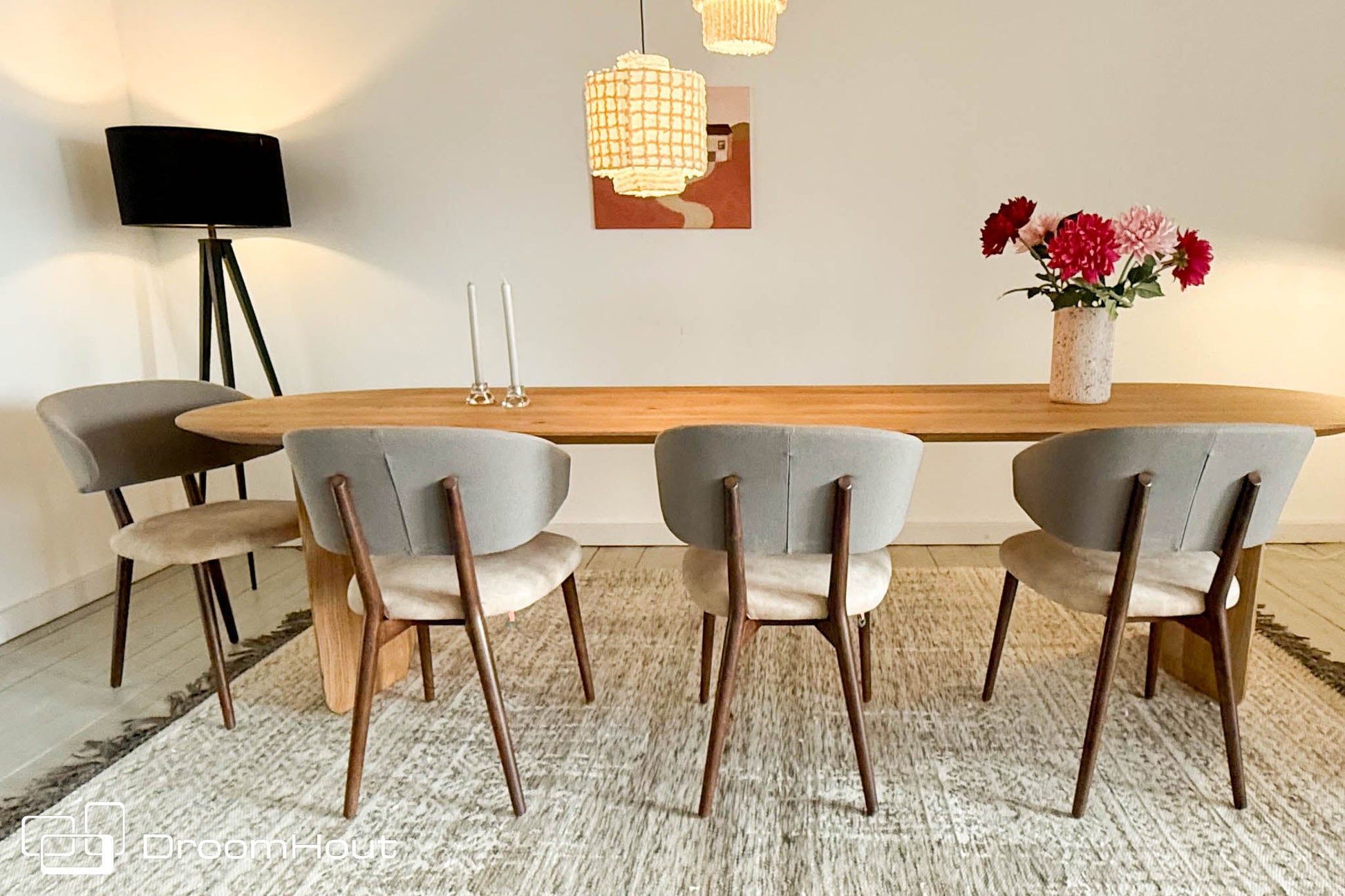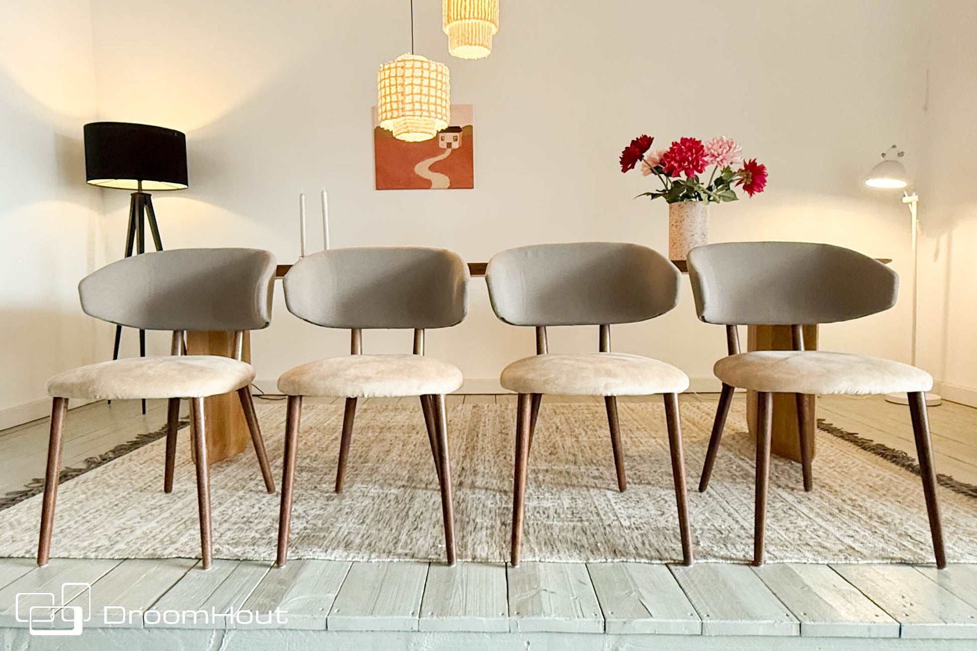 De Toro is verkrijgbaar als een set van 4 en staat klaar voor je in onze showroom. Je kunt hem dus direct ophalen! Deze stijlvolle stoel is bekleed met twee verschillende stoffen de zachte Genova stof in een warme beige tint op de zitting. In combinatie met de Mango stof in taupe op de rugleuning. Een combinatie die in onze ogen perfect matcht met het warm noten frame. Het resultaat? Een warme uitstraling die jou interieur net die extra elegantie brengt.