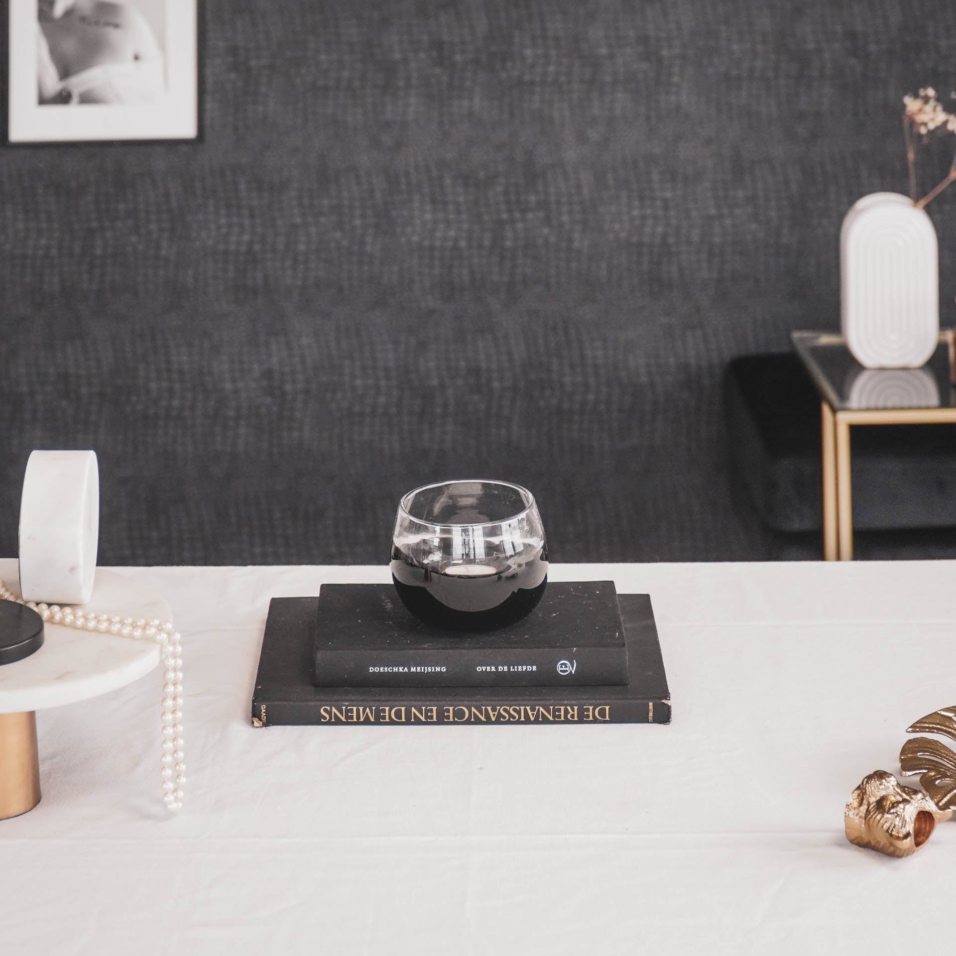 LIGHTEN UP! Deze ronde glazen theelichthouder met zwarte dipdye bodem is de perfecte match met onze vazen in dezelfde dipdye.