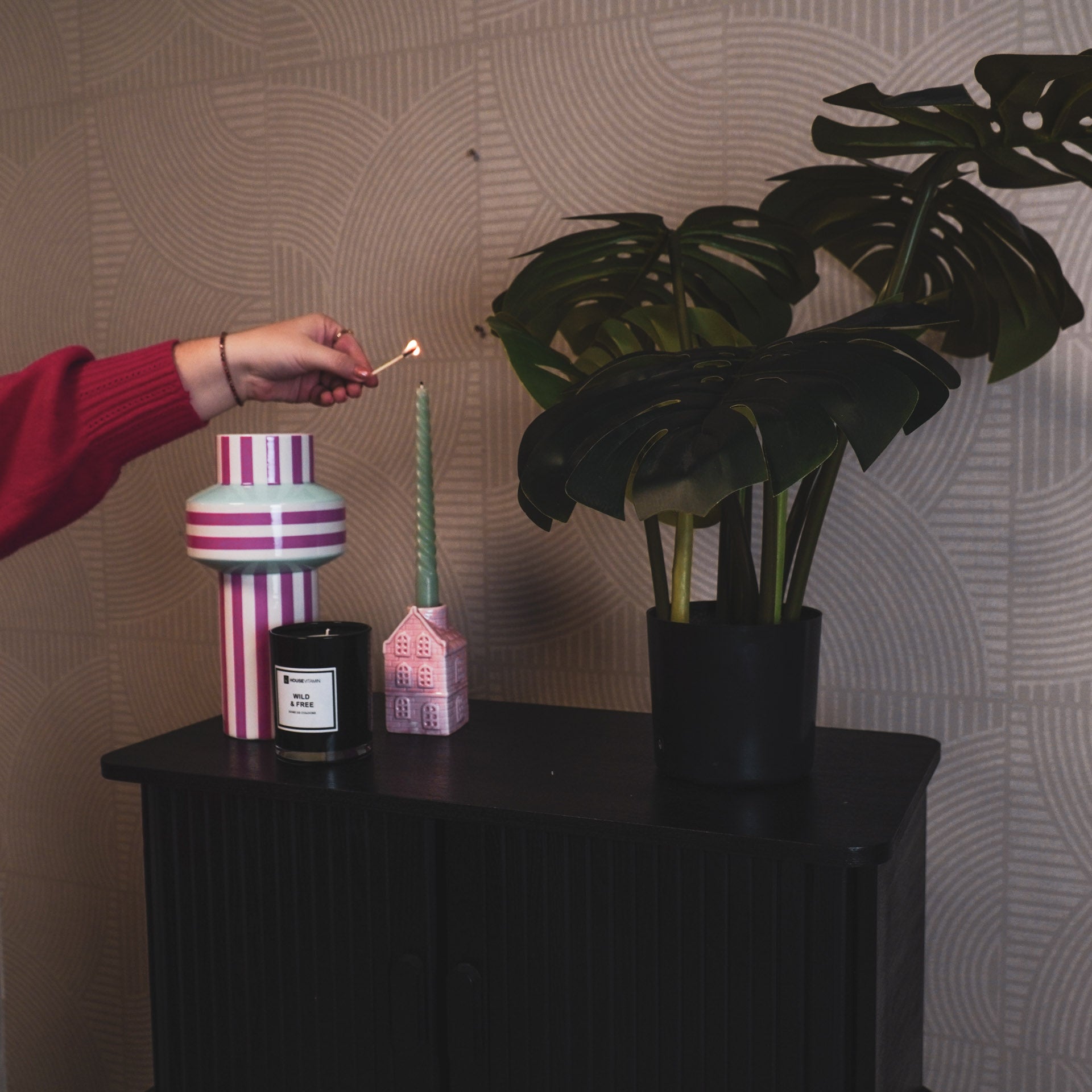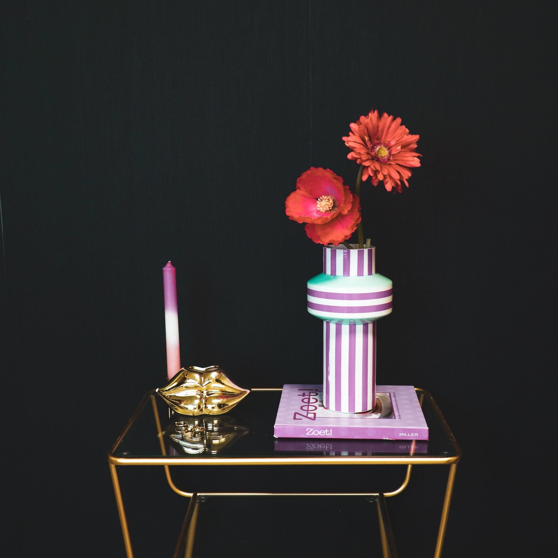 Styling tip: Zonder bloemen staat deze vaas met groene en roze strepen ook prachtig, dus zoek maar gewoon een mooi plekje uit.
