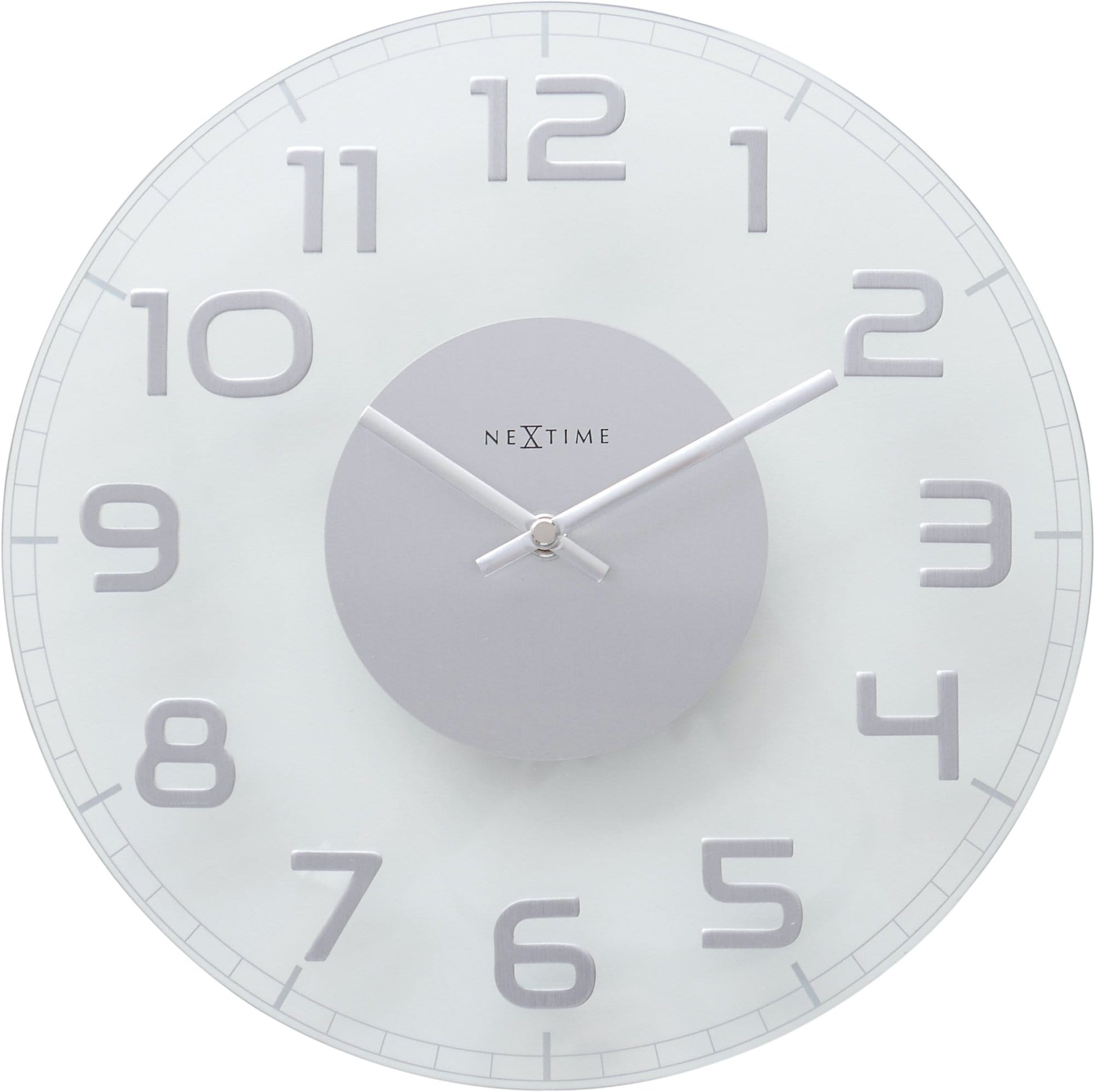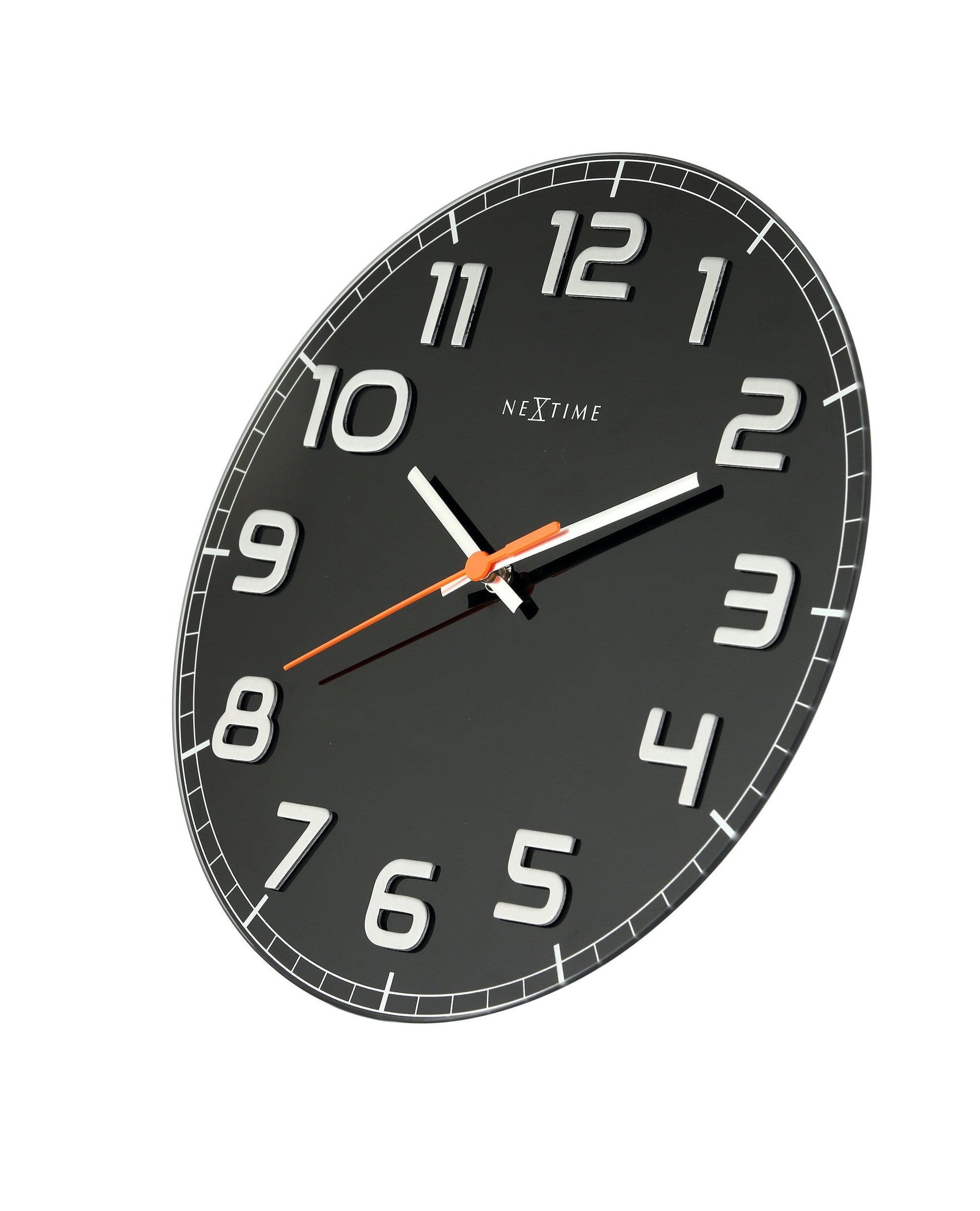 The NeXtime "Classy Round" is a glass wall clock. This round-shaped clock is timeless and basic due to its raised metal numbers. This clock is silent and runs on 1 AA battery (not included).
