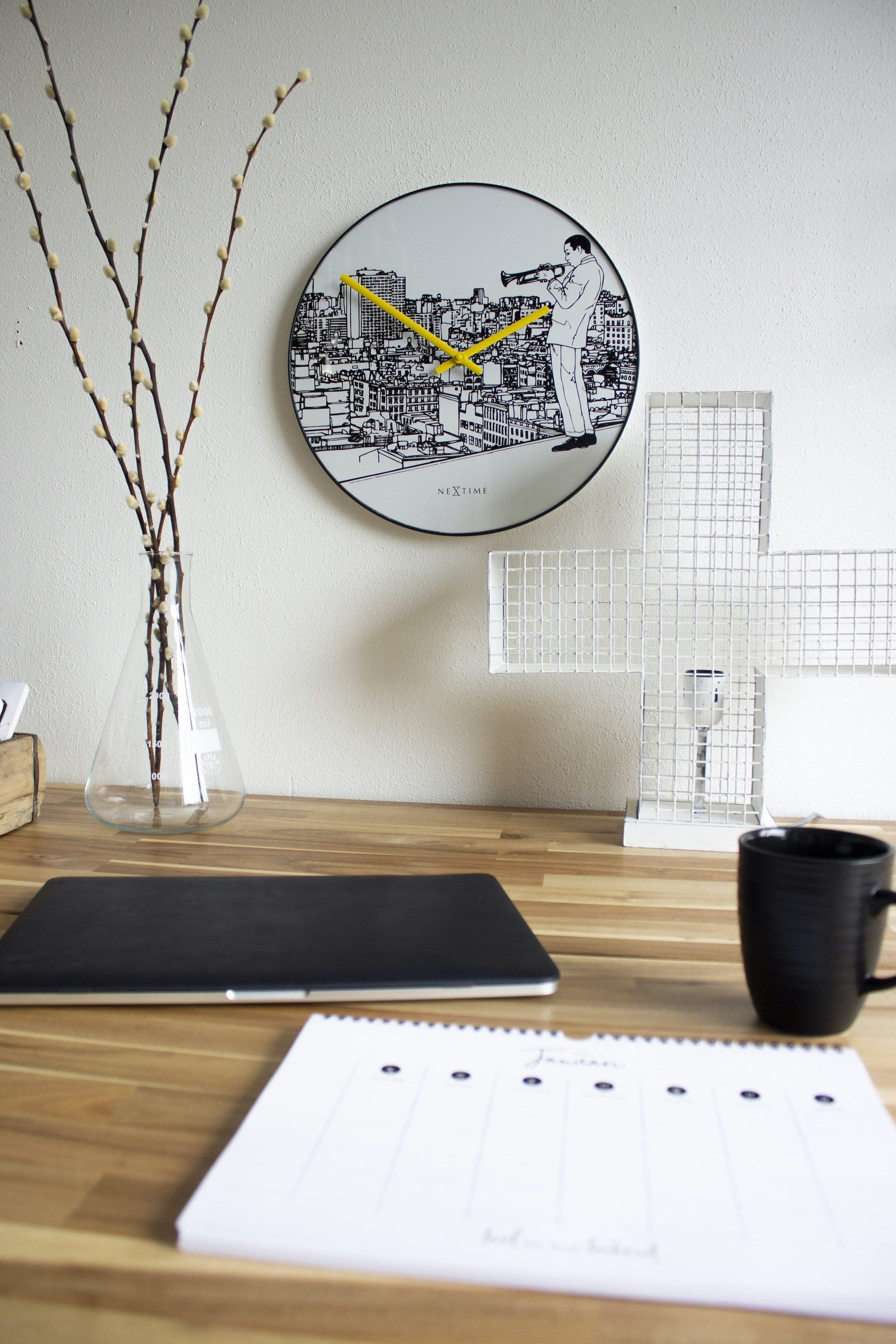 The NeXtime "Trumpet City" is a wall clock (¯ 40 cm) designed by Tim Schoonhoven. The dial is made of glass and has a slim elegant metal edge. This clock has yellow hands and shows an image of a man playing trumpet with a city view for a touch of jazz in your room. The clock is silent and runs on 1x AA battery (not included).