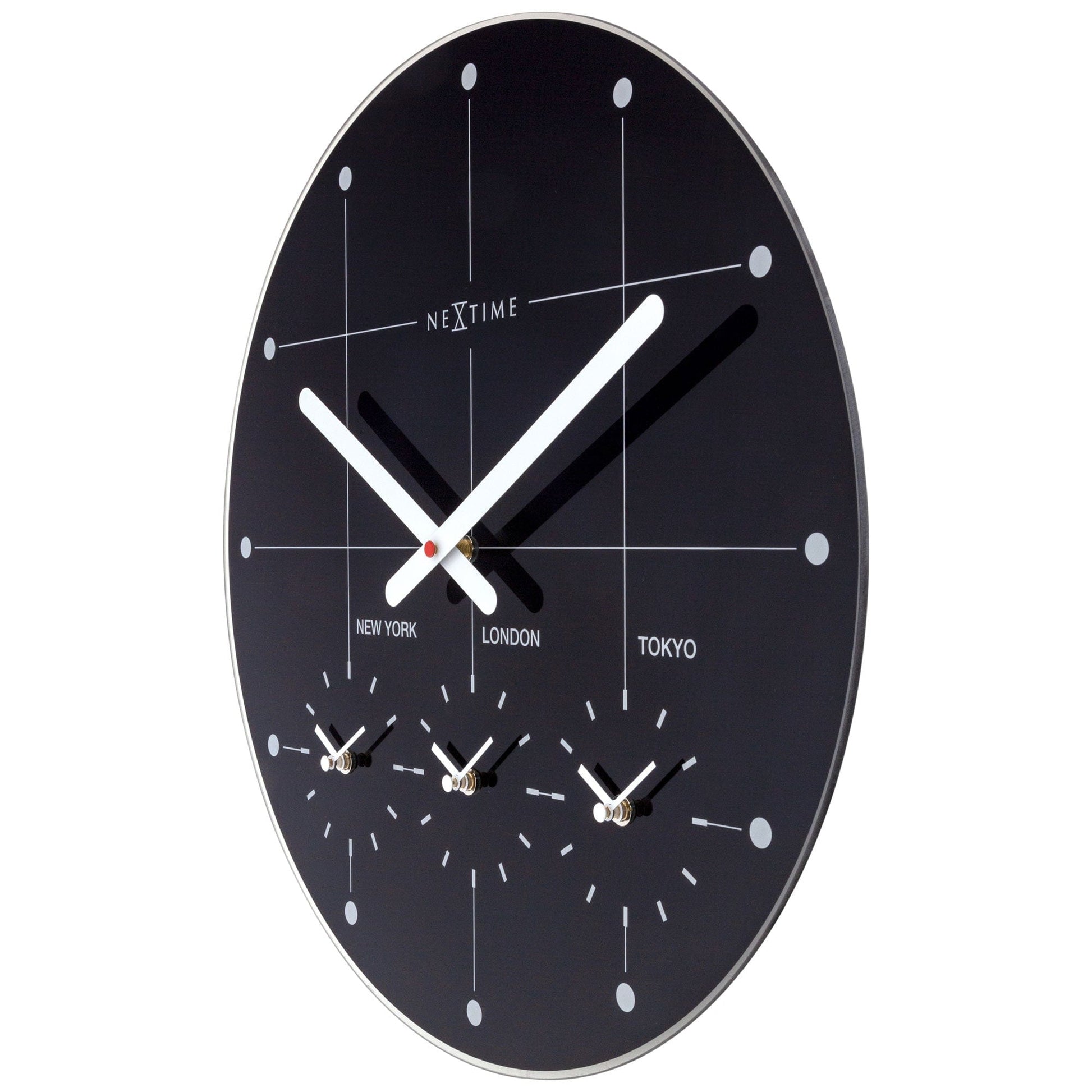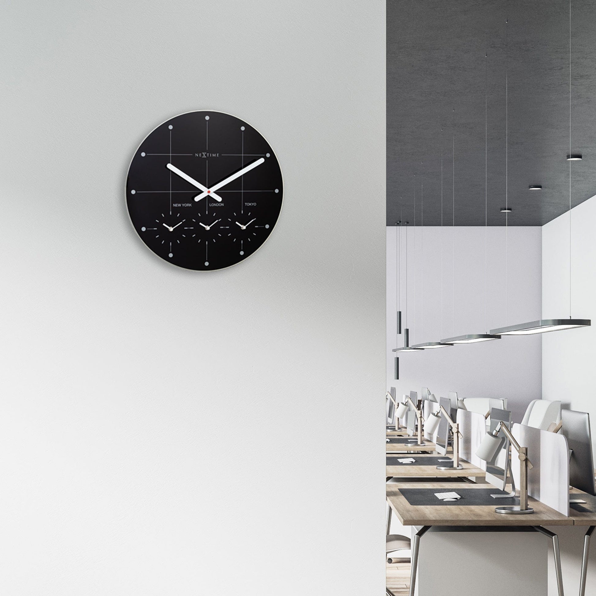 NeXtime’s Big City (43cm) silent wall clock in glass is a best-selling world clock designed by Hans Muller en Hans van Dongen. It displays 3 additional time zones, allowing jetsetters to immediately get a global perspective at just one glance. The black glass dial with white silkscreen print makes it a very outstanding wall clock for the interior. Great for offices (or home offices). This clock runs on 4 x AA battery (not included)