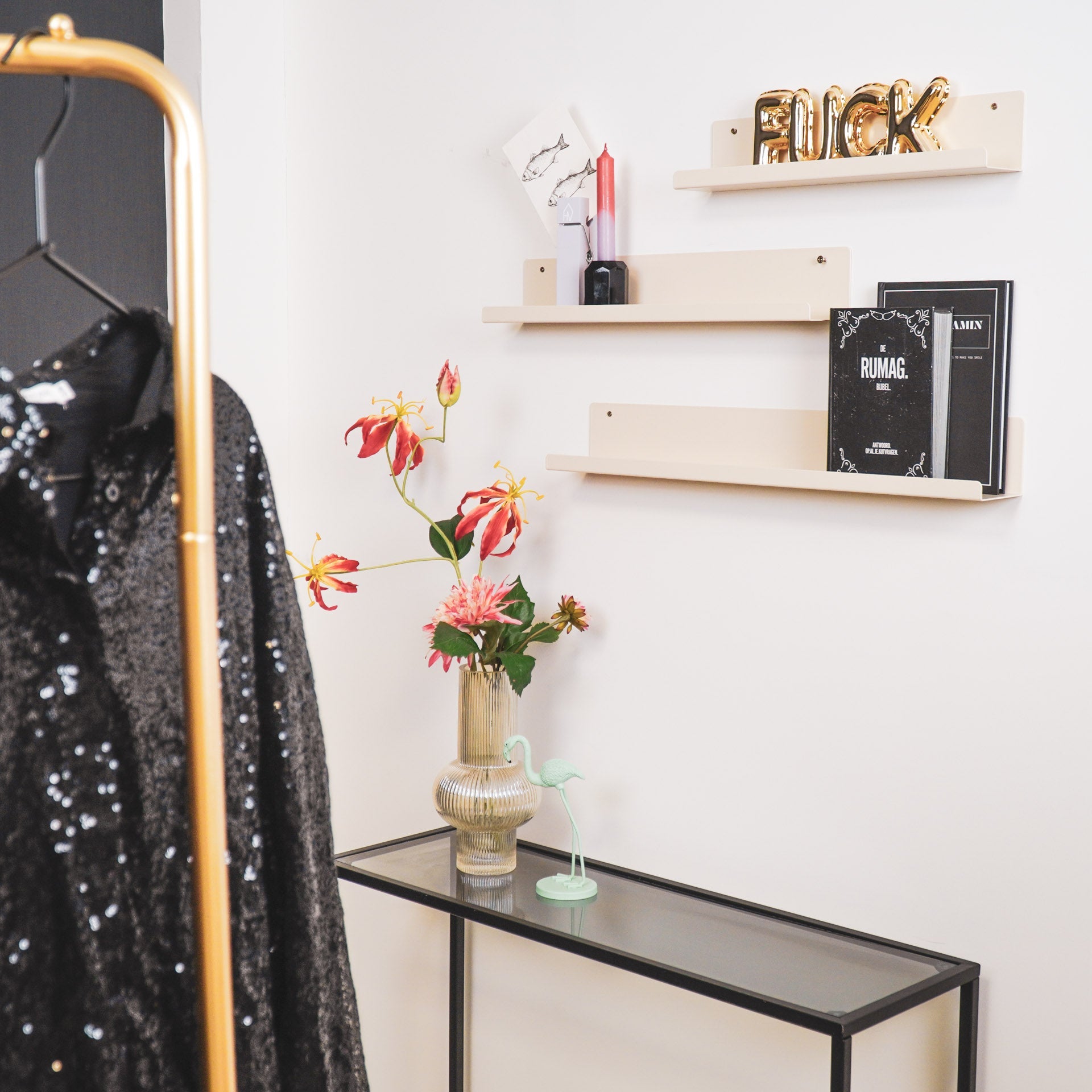 Styling tip: Hang de metalen muur plankjes zo op zoals jij dat wil: speels, kaarsrecht alles is goed!